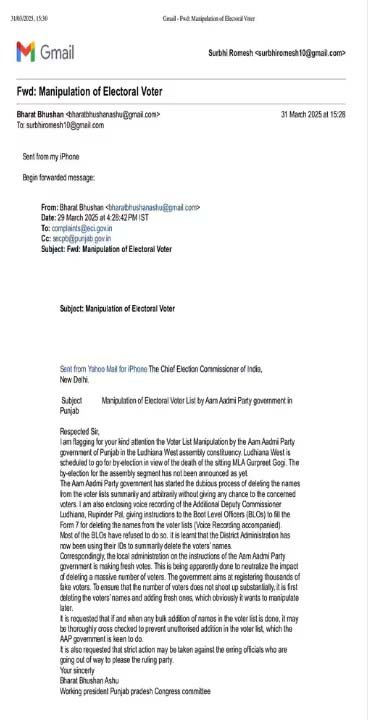 ਪੰਜਾਬ ਕਾਂਗਰਸ ਦੇ ਕਾਰਜਕਾਰੀ ਪ੍ਰਧਾਨ ਅਤੇ ਸਾਬਕਾ ਮੰਤਰੀ ਭਾਰਤ ਭੂਸ਼ਣ ਆਸ਼ੂ ਨੇ ਲੁਧਿਆਣਾ ਪੱਛਮੀ ਵਿਧਾਨ ਸਭਾ ਹਲਕੇ ਵਿੱਚ ਹੋਣ ਵਾਲੀਆਂ ਉਪ ਚੋਣਾਂ ਵਿੱਚ ਆਮ ਆਦਮੀ ਪਾਰਟੀ (ਆਪ) ਦੀ ਅਗਵਾਈ ਵਾਲੀ ਸੂਬਾ ਸਰਕਾਰ ਵੱਲੋਂ ਵੋਟਰ ਸੂਚੀ ਵਿੱਚ ਹੇਰਾਫੇਰੀ ਕੀਤੇ ਜਾਣ ਦੀ ਸ਼ਿਕਾਇਤ ਭਾਰਤੀ ਚੋਣ ਕਮਿਸ਼ਨ (ਈਸੀਆਈ) ਨੂੰ ਕੀਤੀ ਹੈ।