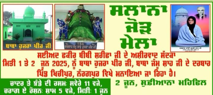 ਹਰ ਸਾਲ ਦੀ ਤਰ੍ਹਾ ਇਸ ਸਾਲ ਵੀ ਪਿੰਡ ਖਿੱਚੀਪੁਰ ਅਤੇ ਨਰੰਗਪੁਰ ਵਿੱਚ ਬਾਬਾ ਜੰਮੂ ਸ਼ਾਹ ਹੁਜਰਾ ਪੀਰ ਦਰਬਾਰ ‘ਤੇ ਸਈਅਦ ਫਕੀਰ ਬੀਬੀ ਸ਼ਰੀਫਾ ਜੀ ਉਦੇਸੀਆ ਵਾਲਿਆ ਦੇ ਅਸ਼ੀਰਵਾਦ ਨਾਲ ਮਨਾਇਆ ਜਾਣ ਵਾਲਾ ਮੇਲਾ ਇਸ ਸਾਲ ਵੀ ਮਿਤੀ 01 ਜੂਨ ਦਿਨ ਐਤਵਾਰ ਅਤੇ ਮਿਤੀ 02 ਜੂਨ ਦਿਨ ਸੋਮਵਾਰ ਨੂੰ ਬਹੁਤ ਹੀ ਸ਼ਰਧਾ ਪੂਰਵਕ ਮਨਾਇਆ ਜਾ ਰਿਹਾ। ਇਸ ਸਬੰਧੀ ਹੋਰ ਜਾਣਕਾਰੀ ਦਿੰਦਿਆਂ ਸੰਦੀਪ ਸਿੰਘ ਅਤੇ ਸਵਰਨਾ ਰਾਮ ਨੇ ਦੱਸਿਆ ਕਿ ਇਹਨਾਂ ਸਮਾਗਮਾਂ ਦੌਰਾਨ ਦੀ ਸ਼ੁਰੂਆਤ ਮਿਤੀ 01 ਜੂਨ ਦਿਨ ਐਤਵਾਰ ਨੂੰ ਚਿਰਾਗ ਰੌਸ਼ਨ ਕਰਨ ਦੀ ਰਸਮ ਨਾਲ ਹੋਵੇਗੀ ਜਿਸ ਦੌਰਾਨ ਸਮੂਹ ਸਾਧ ਸੰਗਤ ਵੱਲੋ ਪੀਰਾਂ ਦੇ ਦਰਬਾਰ ‘ਤੇ ਸਰਬੱਤ ਦੇ ਭਲੇ ਦੀ ਬੇਨਤੀ ਕੀਤੀ ਜਾਵੇਗੀ। ਮਿਤੀ 02 ਜੂਨ ਦਿਨ ਸੋਮਵਾਰ ਨੂੰ ਸੂਫੀਆਨਾ ਮਹਿਫਲ ਲਗਾਈ ਜਾਵੇਗੀ ਜਿਸ ਪੰਜਾਬੀ ਲੋਕ ਗਾਇਕ ਦਲਵਿੰਦਰ ਦਿਆਲਪੁਰੀ, ਐਲਕਸ ਕੋਟੀ, ਦੋਗਾਣਾ ਜੋੜੀ ਸਰਬਜੀਤ ਫੁੱਲ ਅਤੇ ਪ੍ਰੀਤ ਸਮਰਾਲਾ, ਜਸਵਿੰਦਰ ਗੁਲਾਮ, ਚਰਨਜੀਤ ਚੰਨੀ, ਦੋਗਾਣਾ ਜੋੜੀ ਅਮਰੀਕ ਮਾਈਕਲ ਅਤੇ ਆਰ ਕੋਰ ਰੋਜੀ, ਸੂਫੀ ਗਾਇਕ ਰਿੰਪੀ ਭੱਟੀ, ਚਰਨਪ੍ਰੀਤ ਚੰਨੀ, ਆਰਤੀ ਅਨਮੋਲ, ਲਵਿਸ ਚੋਹਾਨ ਵੱਲੋ ਬਾਬਾ ਜੀ ਦੀ ਮਹਿਮਾ ਦਾ ਗੁਣਗਾਨ ਕੀਤਾ ਗਿਆ। ਸਟੇਜ ਸਕੱਤਰ ਦੀ ਭੂਮਿਕਾ ਦਿਨੇਸ਼ ਦੀਪ ਵੱਲੋਂ ਨਿਭਾਈ ਜਾਵੇਗੀ। ਉਹਨਾਂ ਵੱਲੋਂ ਸਮੂਹ ਇਲਾਕੇ ਦੀਆਂ ਸੰਗਤਾਂ ਅਪੀਲ ਕੀਤੀ ਕਿ ਸੰਗਤਾਂ ਹੁੰਮ- ਹੁੰਮਾ ਦੋ ਦਿਨ ਮੇਲੇ ਦੀ ਰੌਣਕ ਨੂੰ ਵਧਾਉਣ ਅਤੇ ਬਾਬਾ ਜੀ ਦਾ ਅਸ਼ੀਰਵਾਦ ਪ੍ਰਾਪਤ ਕਰਨ।