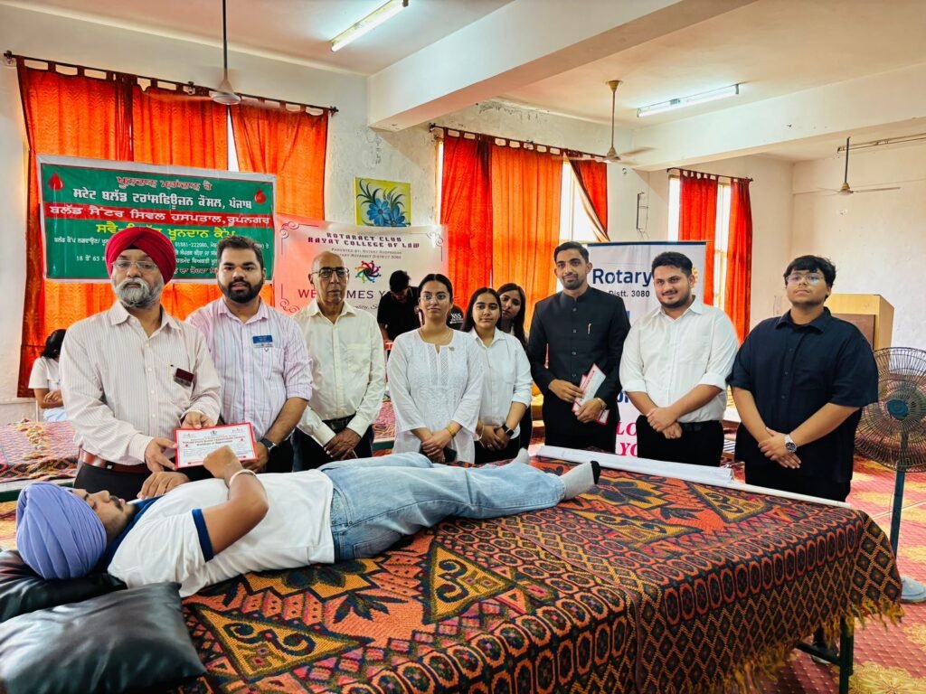 ਰਿਆਤ ਕਾਲਜ ਆਫ਼ ਲਾਅ ਦੀ ਐਨਐਸਐਸ ਯੂਨਿਟ ਨੇ ਐਲਟੀਐਸਯੂ ਪੰਜਾਬ ਦੀ ਐਨਐਸਐਸ ਯੂਨਿਟ ਦੇ ਸਹਿਯੋਗ ਨਾਲ, ਕਾਲਜ ਕੈਂਪਸ ਵਿੱਚ ਇੱਕ ਖੂਨਦਾਨ ਕੈਂਪ ਦਾ ਸਫਲਤਾਪੂਰਵਕ ਆਯੋਜਨ ਕੀਤਾ। ਕੈਂਪ ਦਾ ਉਦਘਾਟਨ ਸ਼੍ਰੀ ਐਨਐਸ ਰਿਆਤ ਚਾਂਸਲਰ ਐਲਟੀਐਸਯੂ ਪੰਜਾਬ ਅਤੇ ਸ਼੍ਰੀ ਬੀ.ਐਸ. ਪੰਨੂ ਮੁੱਖ ਬੁਲਾਰੇ ਪੰਜਾਬ ਸਰਕਾਰ ਦੁਆਰਾ ਸਾਂਝੇ ਤੌਰ ‘ਤੇ ਕੀਤਾ ਗਿਆ। ਉਨ੍ਹਾਂ ਨੇ ਖੂਨਦਾਨੀਆਂ ਅਤੇ ਪ੍ਰਬੰਧਕਾਂ ਦਾ ਸਨਮਾਨ ਕੀਤਾ। ਇਹ ਉੱਤਮ ਉਪਰਾਲਾ ਰੋਟਰੀ ਕਲੱਬ, ਰੂਪਨਗਰ ਦੀ ਉਦਾਰ ਸਪਾਂਸਰਸ਼ਿਪ ਨਾਲ ਕੀਤਾ ਗਿਆ ਸੀ, ਅਤੇ ਖੂਨ ਇਕੱਠਾ ਕਰਨ ਲਈ ਤਕਨੀਕੀ ਸਹਾਇਤਾ ਬਲੱਡ ਬੈਂਕ, ਸਿਵਲ ਹਸਪਤਾਲ, ਰੂਪਨਗਰ ਦੀ ਸਮਰਪਿਤ ਟੀਮ ਦੁਆਰਾ ਪ੍ਰਦਾਨ ਕੀਤੀ ਗਈ ਸੀ।