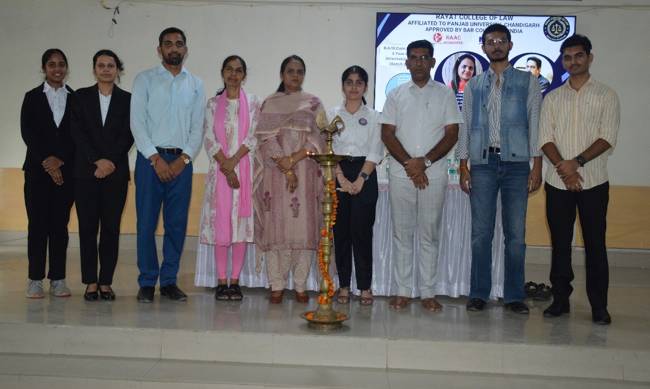 ਬਲਾਚੌਰ 11 ਅਗਸਤ (ਜਤਿੰਦਰ ਪਾਲ ਸਿੰਘ ਕਲੇਰ) ਰਿਆਤ ਕਾਲਜ ਆਫ਼ ਲਾਅ ਰੈਲਮਾਜਰਾ ਨੇ ਬੀਏ/ਬੀ.ਕਾਮ ਐਲਐਲ.ਬੀ (ਆਨਰਜ਼) 5-ਸਾਲਾ ਵਿਦਿਆਰਥੀਆਂ ਦੇ ਨਵੇਂ ਬੈਚ ਲਈ ਓਰੀਐਂਟੇਸ਼ਨ ਪ੍ਰੋਗਰਾਮ ਸਫਲਤਾਪੂਰਵਕ ਕਰਵਾਇਆ। ਇਸ ਪ੍ਰੋਗਰਾਮ ਦਾ ਉਦੇਸ਼ ਵਿਦਿਆਰਥੀਆਂ ਨੂੰ ਅਕਾਦਮਿਕ ਵਾਤਾਵਰਣ, ਸੰਸਥਾਗਤ ਕਦਰਾਂ-ਕੀਮਤਾਂ ਅਤੇ ਕਾਨੂੰਨੀ ਪੇਸ਼ੇ ਵਿੱਚ ਉਪਲਬਧ ਵਿਸ਼ਾਲ ਮੌਕਿਆਂ ਤੋਂ ਜਾਣੂ ਕਰਵਾਉਣਾ ਸੀ।