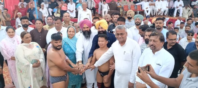 ਕਾਠਗੜ੍ਹ , 19 ਅਗਸਤ (ਜਤਿੰਦਰ ਪਾਲ ਸਿੰਘ ਕਲੇਰ ) ਧੰਨ- ਧੰਨ ਬਾਬਾ ਗੁੱਗਾ ਜਾਹਰ ਵੀਰ ਜੀ ਦੀ ਯਾਦ ਵਿੱਚ ਅਤੇ ਭਗਵਾਨ ਸ਼੍ਰੀ ਕ੍ਰਿਸ਼ਨ ਜਨਮ ਅਸ਼ਟਮੀ ਵਾਲੇ ਦਿਨ ਹਲਕੇ ਦਾ ਪਲੇਠਾ ਸਲਾਨਾ ਛਿੰਝ ਮੇਲਾ ਸਮੂਹ ਦੁਕਾਨਦਾਰ ਭਾਈਚਾਰੇ ਤੇ ਨਗਰ ਨਿਵਾਸੀਆਂ ਦੇ ਸਹਿਯੋਗ ਨਾਲ ਨਗਰ ਪੰਚਾਇਤ ਵੱਲੋਂ ਬਹੁਤ ਹੀ ਉਤਸ਼ਾਹ ਤੇ ਧੂਮਧਾਮ ਨਾਲ ਕਰਵਾਇਆ ਗਿਆ। ਡੇਰਾ ਬਾਬਾ ਟਿੱਬੀ ਸਾਹਿਬ ਕਾਠਗੜ੍ਹ ਦੇ ਮੌਜੂਦਾ ਗੱਦੀ ਨਸ਼ੀਨ ਬਾਪੂ ਸੱਖੀ ਰਾਮ ਜੀ ਦੀ ਅਗਵਾਈ ਅਤੇ ਮੁੱਖ ਸੇਵਾਦਾਰ ਸਾਈਂ ਕਾਲੇ ਸ਼ਾਹ ਦੀ ਦੇਖਰੇਖ ਵਿੱਚ ਕਰਵਾਏ ਗਏ ਇਸ ਵਿਸ਼ਾਲ ਛਿੰਝ ਮੇਲੇ ‘ਚ ਵੱਖ-ਵੱਖ ਪ੍ਰਸਿੱਧ ਅਖਾੜਿਆਂ ਤੋਂ ਸੱਦੇ ਚੋਟੀ ਦੇ ਪਹਿਲਵਾਨਾਂ ਨੇ ਵੱਡੀ ਗਿਣਤੀ ਵਿੱਚ ਆਪਣੀ ਤਾਕਤ ਦੀ ਜ਼ੋਰ ਅਜਮਾਇਸ਼ ਕੀਤੀ। ਇਸ ਛਿੰਝ ਮੇਲੇ ਵਿੱਚ ਡਿਪਟੀ ਸਪੀਕਰ ਜੈ ਕ੍ਰਿਸ਼ਨ ਸਿੰਘ ਰੋੜ੍ਹੀ, ਬਲਾਚੌਰ ਦੀ ਵਿਧਾਇਕਾ ਸ਼੍ਰੀਮਤੀ ਸੰਤੋਸ਼ ਕਟਾਰੀਆ, ਆਪ ਆਗੂ ਅਸ਼ੋਕ ਕਟਾਰੀਆ, ਕਾਂਗਰਸ ਨਵਾਂਸ਼ਹਿਰ ਦੇ ਜ਼ਿਲ੍ਹਾ ਪ੍ਰਧਾਨ ਅਜੇ ਮੰਗੂਪੁਰ, ਜ਼ਿਲਾ ਯੋਜਨਾ ਬੋਰਡ ਦੇ ਚੇਅਰਮੈਨ ਸਤਨਾਮ ਜਲਾਲਪੁਰ ਨੇ ਮੁੱਖ ਮਹਿਮਾਨ ਵਜੋਂ ਸ਼ਿਰਕਤ ਕੀਤੀ ਅਤੇ ਪੰਜਾਬੀ ਗਾਇਕ ਪੰਮਾ ਡੂਮੇਵਾਲ ਨੇ ਵਿਸ਼ੇਸ਼ ਤੌਰ ਤੇ ਪਹੁੰਚ ਕੇ ਹਾਜ਼ਰੀ ਲਗਵਾਈ ਅਤੇ ਦਰਸ਼ਕਾਂ ਨੂੰ ਪੰਜਾਬੀ ਲੋਕ ਤੱਥ ਗਾ ਕੇ ਨਿਹਾਲ ਕੀਤਾ । ਰਾਤ ਕਰੀਬ 9 ਵਜੇ ਤੱਕ ਚੱਲੇ ਇਸ ਛਿੰਝ ਮੇਲੇ ਵਿੱਚ ਇੱਕ ਤੋਂ ਬਾਅਦ ਇੱਕ ਫਸਵੇਂ ਤੇ ਸ਼ਾਨਦਾਰ ਮੁਕਾਬਲਿਆਂ ਨੇ ਹਜ਼ਾਰਾਂ ਦੀ ਗਿਣਤੀ ਵਿੱਚ ਉਮੜੇ ਦਰਸ਼ਕਾਂ ਨੂੰ ਕੀਲ ਕੇ ਰੱਖਿਆ।