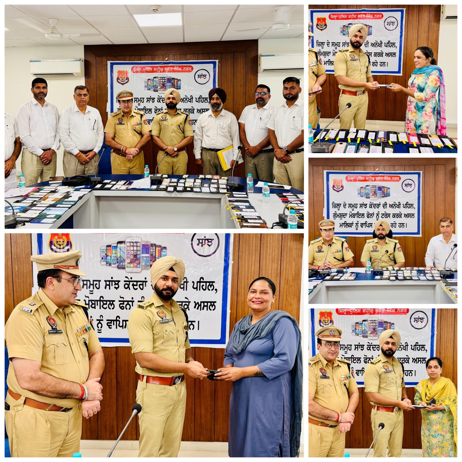 ਨਵਾਂਸ਼ਹਿਰ 19 ਅਗਸਤ – (ਜਤਿੰਦਰ ਪਾਲ ਸਿੰਘ ਕਲੇਰ ) ਡਾ. ਮਹਿਤਾਬ ਸਿੰਘ, ਆਈ.ਪੀ.ਐਸ. ਸੀਨੀਅਰ ਕਪਤਾਨ ਪੁਲਿਸ, ਸ਼ਹੀਦ ਭਗਤ ਸਿੰਘ ਨਗਰ ਜੀ ਵਲੋਂ ਪ੍ਰੈਸ ਨੂੰ ਜਾਣਕਾਰੀ ਦਿੰਦੇ ਹੋਏ ਦੱਸਿਆ ਕਿ ਜਿਲ੍ਹਾ ਪੁਲਿਸ ਵੱਲੋ ਮਾਨਯੋਗ ਡਾਇਰੈਕਟਰ ਜਨਰਲ ਪੁਲਿਸ, ਪੰਜਾਬ ਅਤੇ ਡਿਪਟੀ ਇੰਸਪੈਕਟਰ ਜਨਰਲ ਪੁਲਿਸ, ਲੁਧਿਆਣਾ ਰੇਂਜ, ਲੁਧਿਆਣਾ ਜੀ ਦੇ ਦਿਸ਼ਾ ਨਿਰਦੇਸ਼ ਤਹਿਤ ਗੁੰਮ ਹੋਏ ਮੋਬਾਇਲ ਫੋਨਾ ਨੂੰ ਟਰੇਸ ਕਰਨ ਲਈ ਲਗਾਤਾਰ ਯਤਨ ਕੀਤੇ ਜਾਂਦੇ ਹਨ ਅਤੇ ਟਰੇਸ ਕਰਕੇ ਅਸਲ ਮਾਲਕਾ ਦੇ ਹਵਾਲੇ ਕੀਤਾ ਜਾਂਦਾ ਹੈ।ਇਸ ਸਬੰਧੀ ਉਨ੍ਹਾ ਨੇ ਅੱਗੇ ਜਾਣਕਾਰੀ ਦਿੰਦੇ ਹੋਏ ਆਫਦੱਸਿਆ ਕਿ ਜਿਲ੍ਹਾ ਦੇ ਪੁਲਿਸ ਥਾਣਿਆ ਅਤੇ ਸਾਂਝ ਕੇਂਦਰਾਂ ਵਿੱਚ ਆਮ ਪਬਲਿਕ ਵੱਲੋਂ ਉਹਨਾਂ ਦੇ ਮੋਬਾਇਲ ਗੁੰਮ ਹੋਣ ਸਬੰਧੀ ਕਾਫੀ ਸ਼ਿਕਾਇਤਾਂ ਪ੍ਰਾਪਤ ਹੋਈਆ ਸਨ। ਇਹਨਾਂ ਸ਼ਿਕਾਇਤਾਂ ਤੇ ਕੰਮ ਕਰਦੇ ਹੋਏ ਜਿਲ੍ਹਾ ਪੁਲਿਸ ਵੱਲੋਂ ਇਹਨਾਂ ਗੁੰਮ ਹੋਏ ਮੋਬਾਇਲਾਂ ਨੂੰ ਟਰੇਸ ਕਰਨ ਲਈ ਤਕਨੀਕੀ ਸੰਲ ਦੀ ਸਹਾਇਤਾ ਨਾਲ ਇੱਕ ਸਪੈਸ਼ਲ ਮੁਹਿੰਮ ਚਲਾਈ ਗਈ ਅਤੇ ਆਮ ਪਬਲਿਕ ਦੇ ਗੁੰਮ ਹੋਏ 155 ਮੋਬਾਇਲ ਫੋਨਾਂ ਨੂੰ ਟਰੇਸ ਕਰਨ ਵਿੱਚ ਸਫਲਤਾ ਹਾਸਲ ਕੀਤੀ।ਡਾ. ਮਹਿਤਾਬ ਸਿੰਘ, ਆਈ.ਪੀ.ਐਸ. ਸੀਨੀਅਰ ਕਪਤਾਨ ਪੁਲਿਸ, ਸ਼ਹੀਦ ਭਗਤ ਸਿੰਘ ਨਗਰ ਵੱਲੋਂ ਅੱਜ ਇਹ ਗੁੰਮ ਹੋਏ 155 ਮੋਬਾਇਲ ਫੋਨ ਉਹਨਾ ਦੇ ਮਾਲਕਾਂ ਦੇ ਹਵਾਲੇ ਕੀਤੇ ਗਏ। ਉਨ੍ਹਾ ਵੱਲੋ ਆਮ ਪਬਲਿਕ ਨੂੰ ਅਪੀਲ ਵੀ ਕੀਤੀ ਗਈ ਕਿ ਸੀਈਆਈਆਰ ਪੋਰਟਲ ਵਿੱਚ ਆਪਣੇ ਗੁੰਮ ਹੋਏ ਮੋਬਾਇਲ ਫੋਨਾਂ ਸਬੰਧੀ ਸ਼ਿਕਾਇਤ ਦਰਜ ਕੀਤੀ ਜਾਵੇ ਤਾਂ ਜੋ ਮੋਬਾਇਲ ਫੋਨਾਂ ਨੂੰ ਜਲਦ ਤੋਂ ਜਲਦ ਟਰੇਸ ਕਰਕੇ ਸਬੰਧਤ ਅਸਲ ਮਾਲਕਾ ਦੇ ਹਵਾਲੇ ਕੀਤਾ ਜਾ ਸਕੇ।