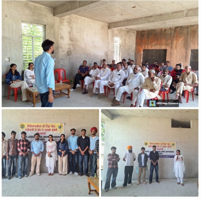 ਬਲਾਚੌਰ, 30 ਸਤੰਬਰ – (ਜਤਿੰਦਰ ਪਾਲ ਸਿੰਘ ਕਲੇਰ ) ਪੀ.ਏ.ਯੂ-ਖੇਤੀਬਾੜੀ ਕਾਲਜ ਬੱਲੋਵਾਲ ਸੱਖੜੀ ਦੇ ਚੌਥੇ ਸਾਲ ਦੇ ਵਿਦਿਆਰਥੀਆਂ ਵੱਲੋਂ ਪਿੰਡ ਰਾਜੂਮਾਜਰਾ ਵਿੱਚ ਕਿਸਾਨ ਜਾਗਰੂਕਤਾ ਕੈਂਪ ਦਾ ਆਯੋਜਨ ਕੀਤਾ ਗਿਆ। ਇਹ ਕੈਂਪ ਵਿਦਿਆਰਥੀਆਂ ਦੀ ਪਿੰਡਾਂ ਵਿੱਚ ਖੇਤੀਬਾੜੀ ਦੇ ਕੰਮ ਦੇ ਤਜਰਬੇ ਸੰਬੰਧੀ ਸਿਖਲਾਈ (RAWE) ਪ੍ਰੋਗਰਾਮ ਦੇ ਤਹਿਤ ਆਯੋਜਿਤ ਕੀਤਾ ਗਿਆ, ਜਿਸ ਦਾ ਮੁੱਖ ਉਦੇਸ਼ ਖੇਤੀਬਾੜੀ ਦੀਆਂ ਸਮੱਸਿਆਵਾਂ ਨੂੰ ਹੱਲ ਕਰਨਾ ਅਤੇ ਅਕਾਦਮਿਕ ਗਿਆਨ ਨੂੰ ਵਿਹਾਰਿਕ ਸਿੱਖਿਆ ਦੇ ਨਾਲ ਜੋੜਨਾ ਸੀ।