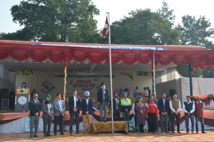 ਬਲਾਚੌਰ 21 ਨਵੰਬਰ ( ਜਤਿੰਦਰ ਪਾਲ ਸਿੰਘ ਕਲੇਰ ) ਲੈਮਰਿਨ ਟੈਕ ਸਕਿੱਲਜ਼ ਯੂਨੀਵਰਸਿਟੀ ਨੇ ਆਪਣੀ ਸਲਾਨਾ ਗ੍ਰੈੰਡ ਐਥਲੈਟਿਕ ਮੀਟ 2025 ਦੀ ਸਫਲਤਾਪੂਰਵਕ ਮੇਜ਼ਬਾਨੀ ਕੀਤੀ, ਜਿਸ ਵਿੱਚ ਵਿਦਿਆਰਥੀਆਂ, ਫੈਕਲਟੀ ਅਤੇ ਪਤਵੰਤਿਆਂ ਨੂੰ ਖੇਡ ਭਾਵਨਾ ਦੇ ਇੱਕ ਜੀਵੰਤ ਅਤੇ ਊਰਜਾਵਾਨ ਦਿਨ ਲਈ ਇਕੱਠਾ ਕੀਤਾ ਗਿਆ। ਯੂਨੀਵਰਸਿਟੀ ਦੇ ਵੱਖ-ਵੱਖ ਵਿਭਾਗਾਂ ਦੇ ਲਗਭਗ 525 ਤੋਂ ਵੱਧ ਵਿਦਿਆਰਥੀਆਂ ਨੇ ਮਾਰਚ ਪਾਸਟ ਅਤੇ ਕਈ ਖੇਡ ਸਮਾਗਮਾਂ ਵਿੱਚ ਉਤਸ਼ਾਹ ਨਾਲ ਹਿੱਸਾ ਲਿਆ।