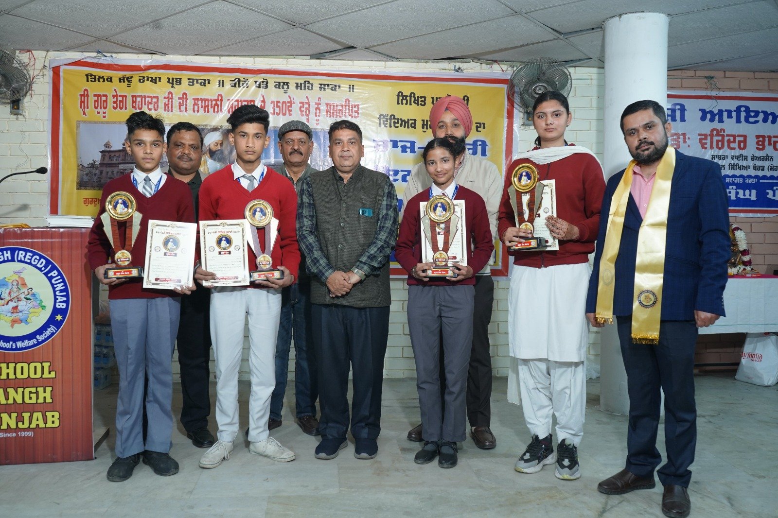 ਅੱਜ ਲੁਧਿਆਣਾ ਵਿਖੇ ਕਰਵਾਏ ਗਏ ਵਿਸ਼ਾਲ ਰਾਜ ਪੱਧਰੀ ਸਨਮਾਨ ਸਮਾਰੋਹ ਵਿੱਚ ਸਕੂਲ ਸੰਗ ਪੰਜਾਬ ਵੱਲੋਂ ਸਾਰੇ ਜੇਤੂਆਂ ਨੂੰ ਸਨਮਾਨਿਤ ਕੀਤਾ ਗਿਆ। ਸਮਾਗਮ ਵਿੱਚ ਪੰਜਾਬ ਸਰਕਾਰ ਵੱਲੋਂ ਇਲਾਕੇ ਦੇ ਵਿਧਾਇਕ ਮਹੋਦਇ ਤੇ ਪੰਜਾਬ ਸਕੂਲ ਸਿੱਖਿਆ ਬੋਰਡ ਦੇ ਸਾਬਕਾ ਉਪ ਚੇਅਰਮੈਨ ਵੀ ਵਿਸ਼ੇਸ਼ ਤੌਰ ’ਤੇ ਮੌਜੂਦ ਰਹੇ। ਦੋਵਾਂ ਮਹਾਨੁਭਾਵਾਂ ਨੇ ਜੇਤੂ ਵਿਦਿਆਰਥੀਆਂ ਨੂੰ ਟਰਾਫੀਆਂ, ਪ੍ਰਸ਼ਸਤੀ ਪੱਤਰ ਦਿੱਤੇ ਤੇ ਉਨ੍ਹਾਂ ਦੀ ਪਿੱਠ ਥਪਥਪਾ ਕੇ ਭਵਿੱਖ ਲਈ ਵਧਾਈਆਂ ਦਿੱਤੀਆਂ।